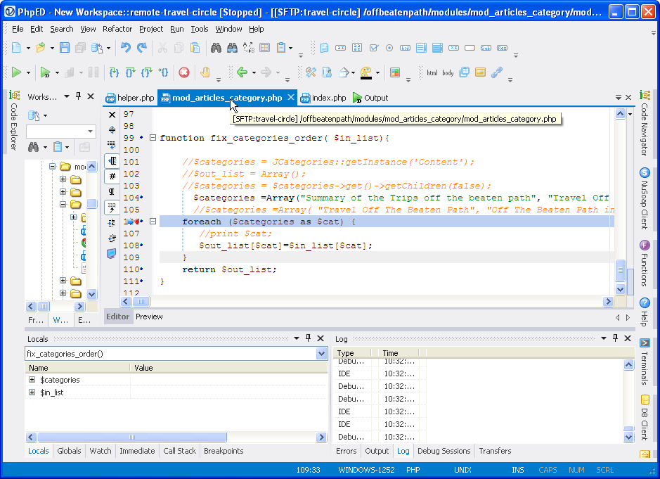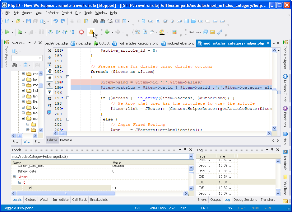 However, it should be noted that while debugging site live is fine – dbg debugger used by NuSphere will only get invoked on a request from specific IP – editing scripts live is hardly a good practice. Source control and development version of a web site are certainly good practice and there is a support for an integration of Tortoise GIT and SVN in PhpED, however native built client would be a much better feature.