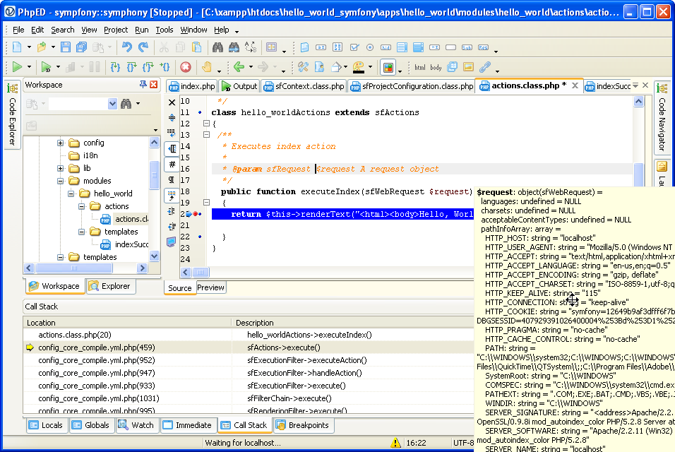 Ironically the most difficult task which is debugging of Symfony application is very easy if you have good PHP IDE. If you used Project Settings wizard in PhpED NuSphere's dbg - PHP debugger is already installed on XAMPP's apache. There is more than one way to start debugging session:
