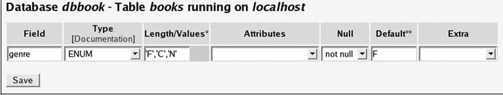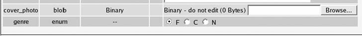 We add a field named genre and define it as an ENUM. For now, we choose to put short codes in the value list, and one of them (F) as the default value: