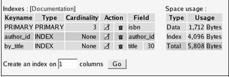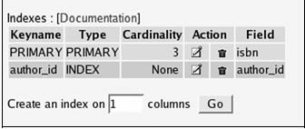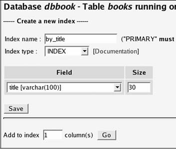 of this index to reduce the space used by the on-disk index structure. The Create an index on 1 column option is appropriate, so we click Go. In the next screen, we specify the index details as shown in the following