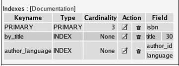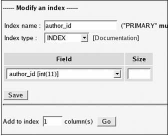 We click the Edit link (small pencil) on the line containing the author_id index and choose to add one column to this index as shown in the following screenshot: