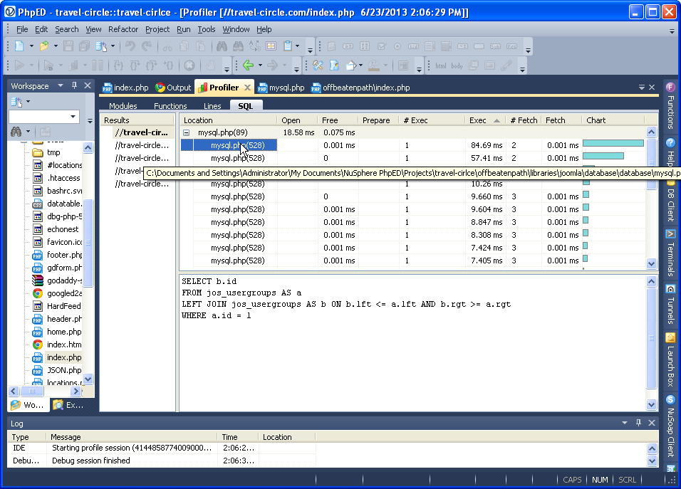 In the example above we got to see all of the crazy sql created and executed by Joomla in one simple request to open a page. Double clicking on the line in the profiler takes you right to the place in the source code where it is located: